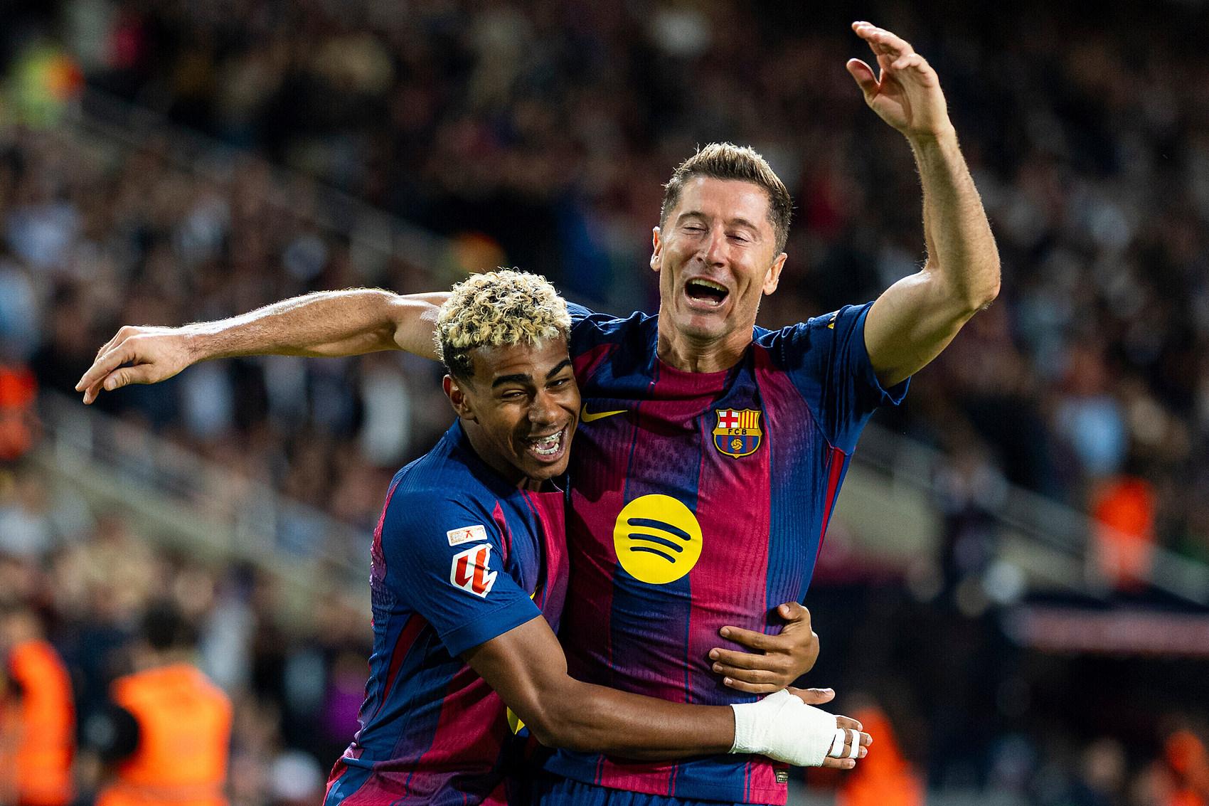 巴塞罗那没有浪费皇家马德里本轮输球的机会,9月29日在西甲第7轮比赛中,巴萨主场以2比1逆转皇家社会,亚马尔为莱万多夫斯基的制胜球送上助攻。巴萨以6胜1平积19分的战绩升至积分榜首位,皇马6胜1负积18分紧随其后。
